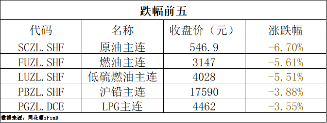8月5日,国内商品期货收盘,多数下跌。原油跌超6%,燃油、低硫燃油跌超5%,沪铅、LPG跌超3%;硅铁涨超2%,铁矿石、生猪、红枣、线材涨超1%。