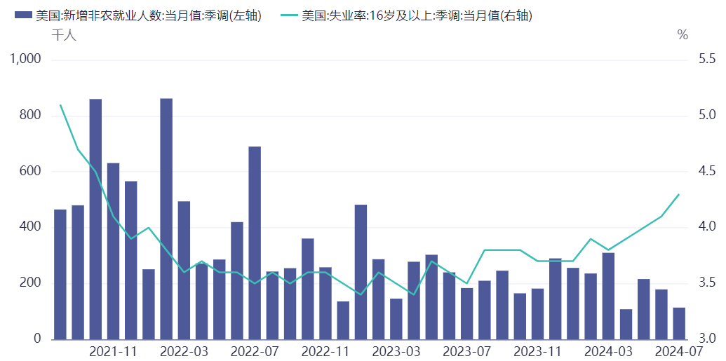 上周,美国劳工统计局公布的数据显示,美国7月非农就业人口增长11.4万人,为2020年12月以来最低纪录,远不及预期的17.5万人,较前值20.6万人大幅下降。7月失业率较前月上升0.2个百分点至4.3%,创下2021年10月以来最高纪录,超过预期4.1%。工资通胀继续降温,7月时薪环比上涨0.2%,略低于预期和前值的0.3%,同比上涨3.6%,不及预期3.7%,前值为3.9%。整体上,美国就业市场有所降温。