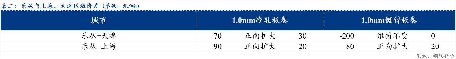 今日冷轧板卷乐从与天津价差较上一交易日扩大30元/吨,乐从与上海价差较上一交易日扩大20元/吨;镀锌板卷乐从与天津价差较上一交易日持平,与上海价差较上一交易日扩大20元/吨。品种价差方面,镀冷价差较上一交易日持平,镀热价差较上一交易日扩大40元/吨,冷热价差较上一交易日扩大40元/吨。