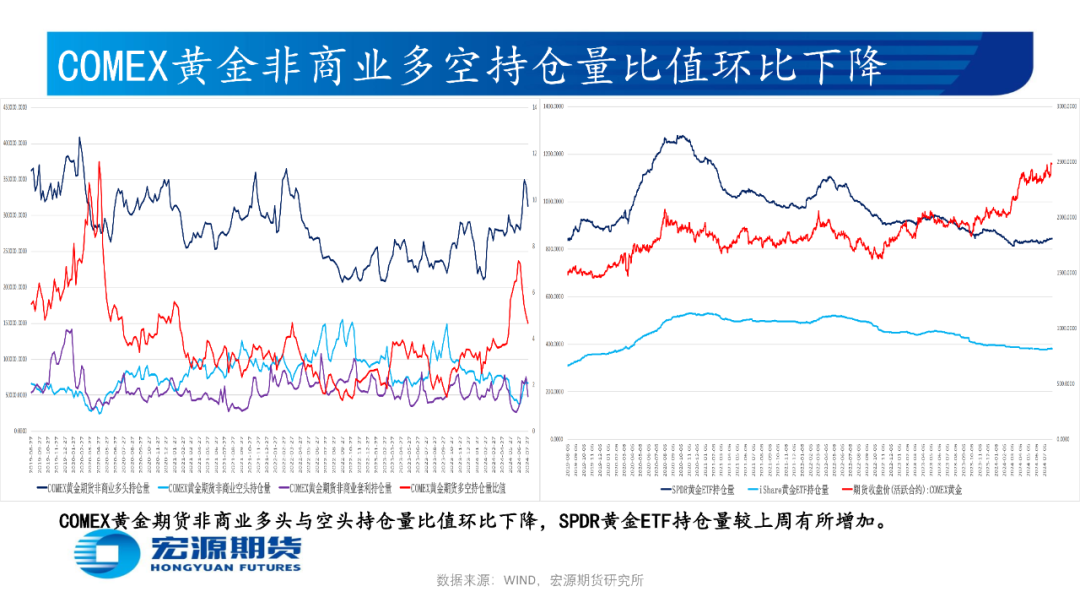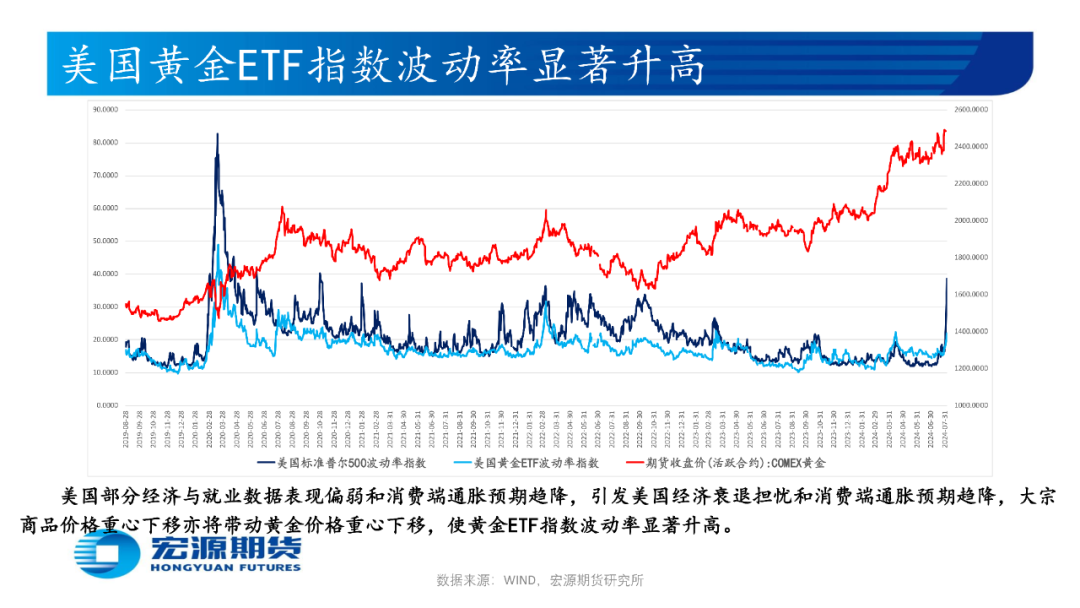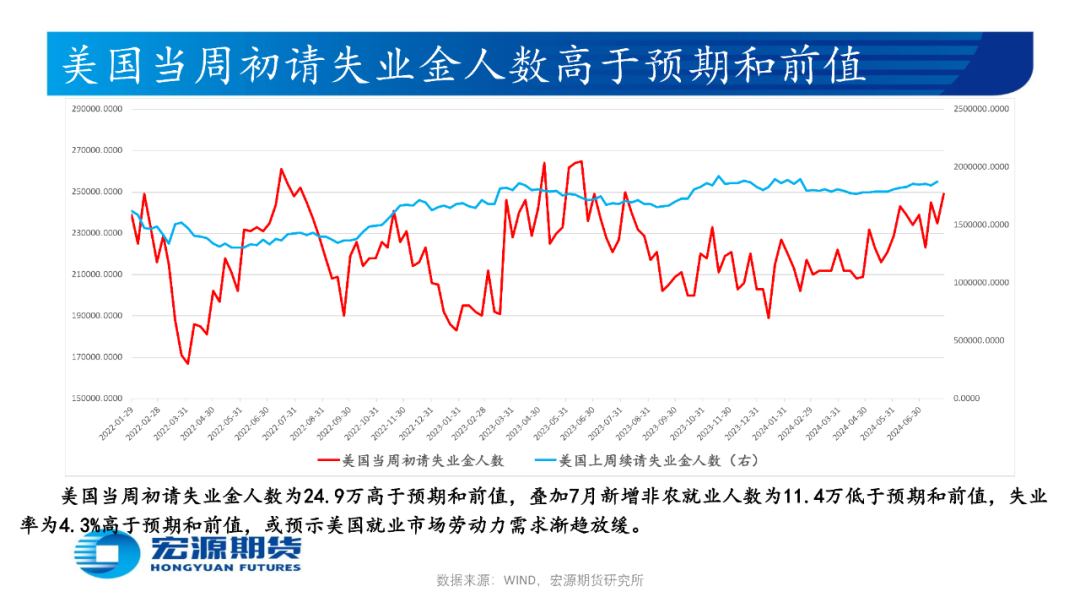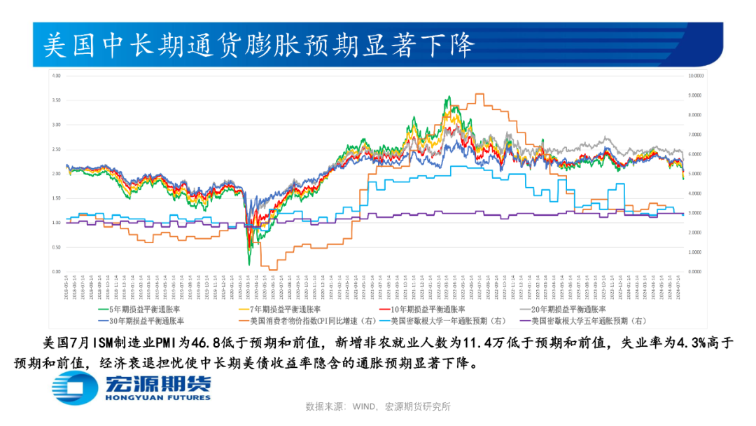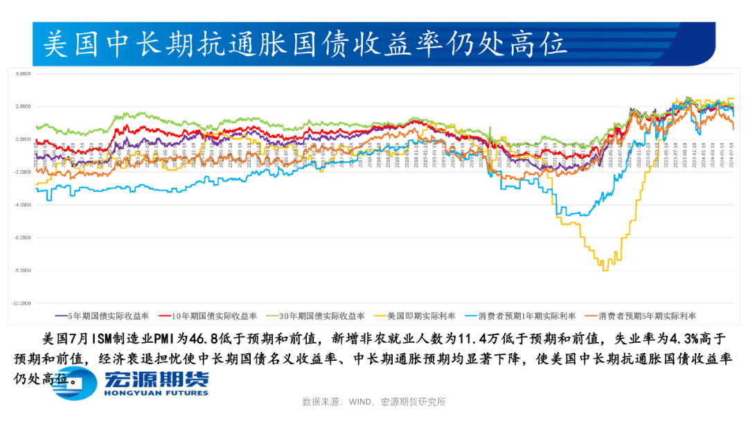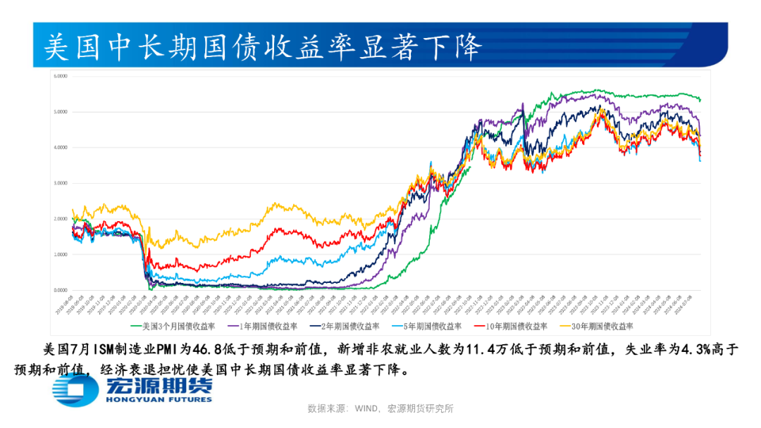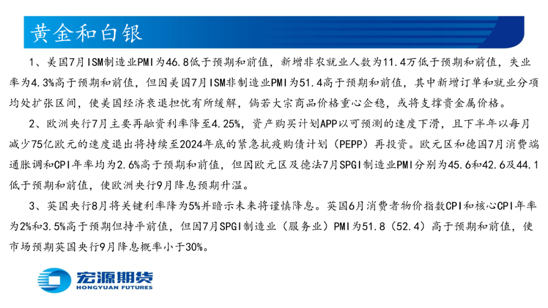 1、美国7月ISM制造业PMI为46.8低于预期和前值,新增非农就业人数为11.4万低于预期和前值,失业率为4.3%高于预期和前值,但因美国7月ISM非制造业PMI为51.4高于预期和前值,其中新增订单和就业分项均处扩张区间,使美国经济衰退担忧有所缓解,倘若大宗商品价格重心企稳,或将支撑贵金属价格。