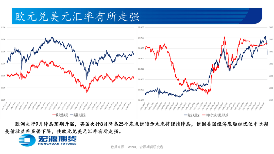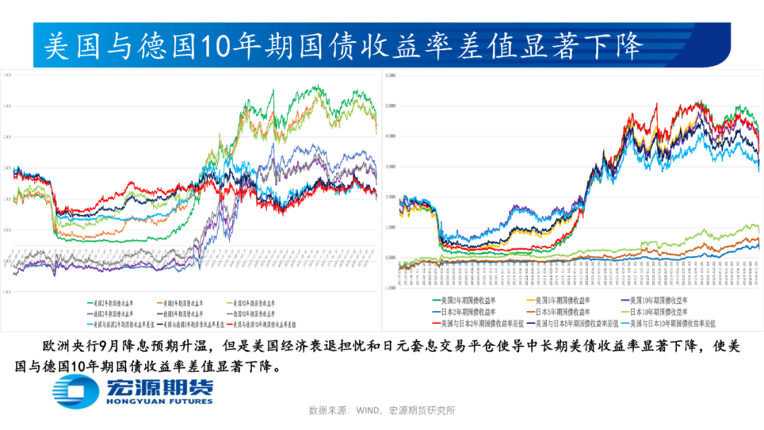 2、欧洲央行7月主要再融资利率降至4.25%,资产购买计划APP以可预测的速度下滑,且下半年以每月减少75亿欧元的速度退出将持续至2024年底的紧急抗疫购债计划(PEPP)再投资。欧元区和德国7月消费端通胀调和CPI年率均为2.6%高于预期和前值,但因欧元区及德法7月SPGI制造业PMI分别为45.6和42.6及44.1低于预期和前值,使欧洲央行9月降息预期升温。