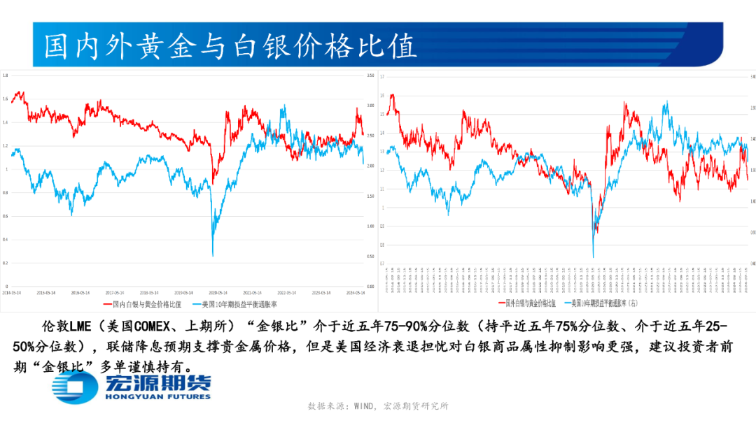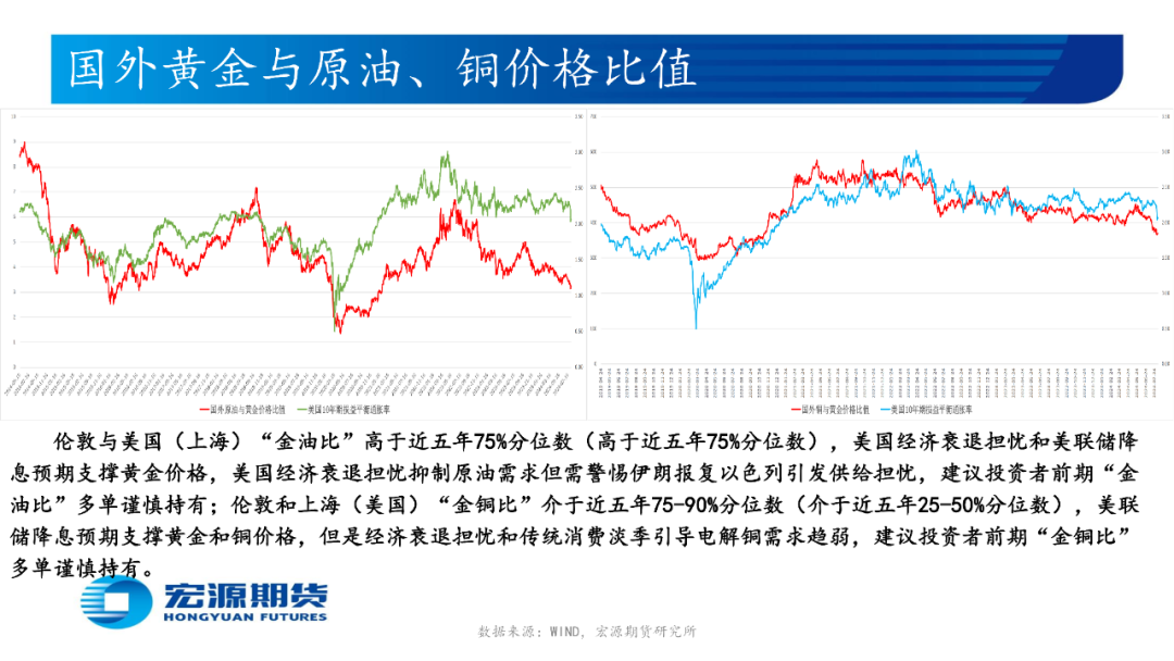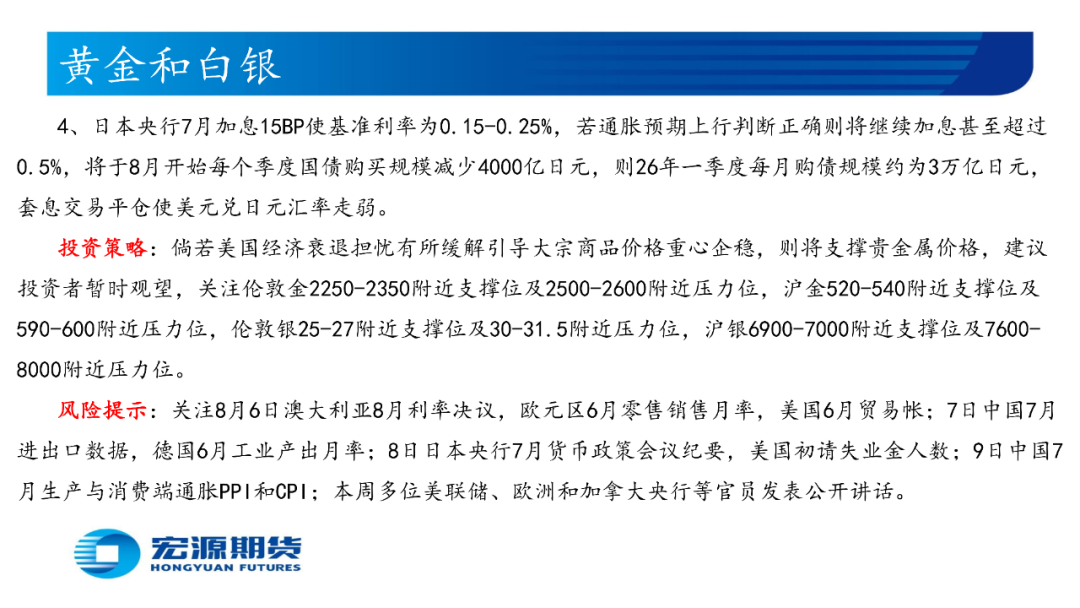 投资策略:倘若美国经济衰退担忧有所缓解引导大宗商品价格重心企稳,则将支撑贵金属价格,建议投资者暂时观望,关注伦敦金2250-2350附近支撑位及2500-2600附近压力位,沪金520-540附近支撑位及590-600附近压力位,伦敦银25-27附近支撑位及30-31.5附近压力位,沪银6900-7000附近支撑位及7600-8000附近压力位。