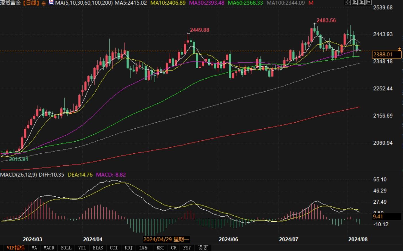 北京时间8月7日7:16,现货黄金报2387.84美元/盎司