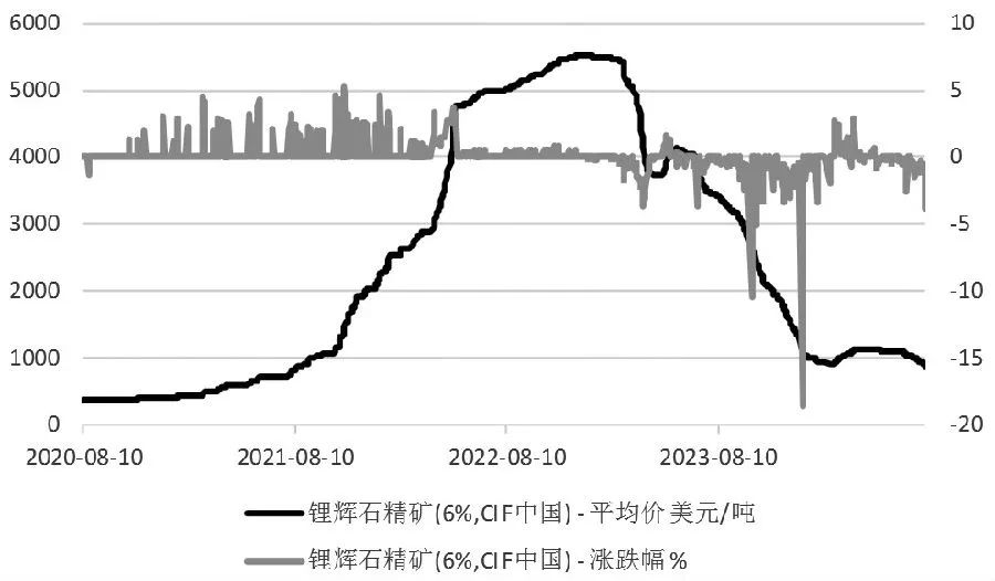 图为锂辉石价格变化情况(单位:美元/吨、%)