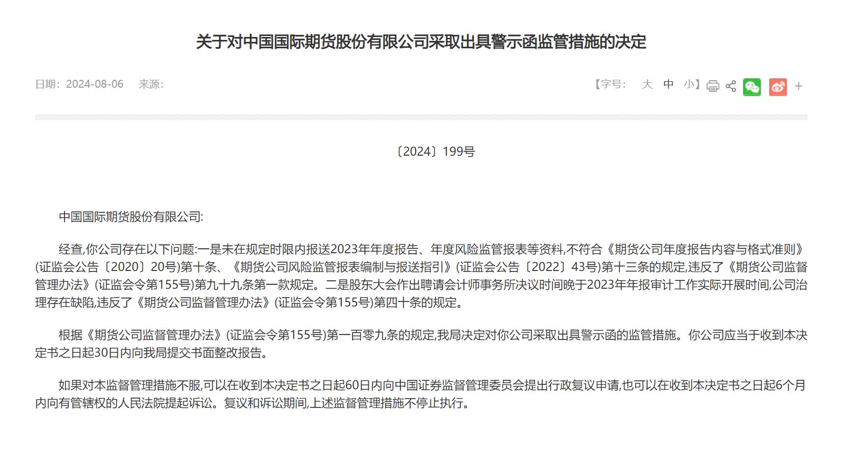 中国网财经8月7日讯昨日,北京证监局公布相关监管措施决定显示,经查,中国国际期货股份有限公司(简称:国际期货)存在以下问题:一是未在规定时限内报送2023年年度报告、年度风险监管报表等资料,不符合《期货公司年度报告内容与格式准则》(证监会公告〔2020〕20号)第十条,《期货公司风险监管报表编制与报送指引》(证监会公告〔2022〕43号)第十三条的规定,违反了《期货公司监督管理办法》(证监会令第155号)第九十九条第一款规定。二是股东大会作出聘请会计师事务所决议时间晚于2023年年报审计工作实际开展时间,公司治理存在缺陷,违反了《期货公司监督管理办法》(证监会令第155号)第四十条的规定。
