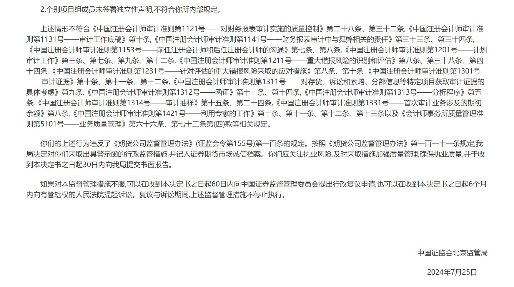 东审会计师事务所及贾凡、宋东亚上述行为违反了《期货公司监督管理办法》(证监会令第155号)第一百条的规定。按照《期货公司监督管理办法》第一百一十一条规定,北京证监局决定对东审会计师事务所及贾凡、宋东亚采取出具警示函的行政监管措施,并记入证券期货市场诚信档案。东审会计师事务所及贾凡、宋东亚应关注执业风险,及时采取措施加强质量管理,确保执业质量,并于收到本决定书之日起30日内向北京证监局提交书面报告。