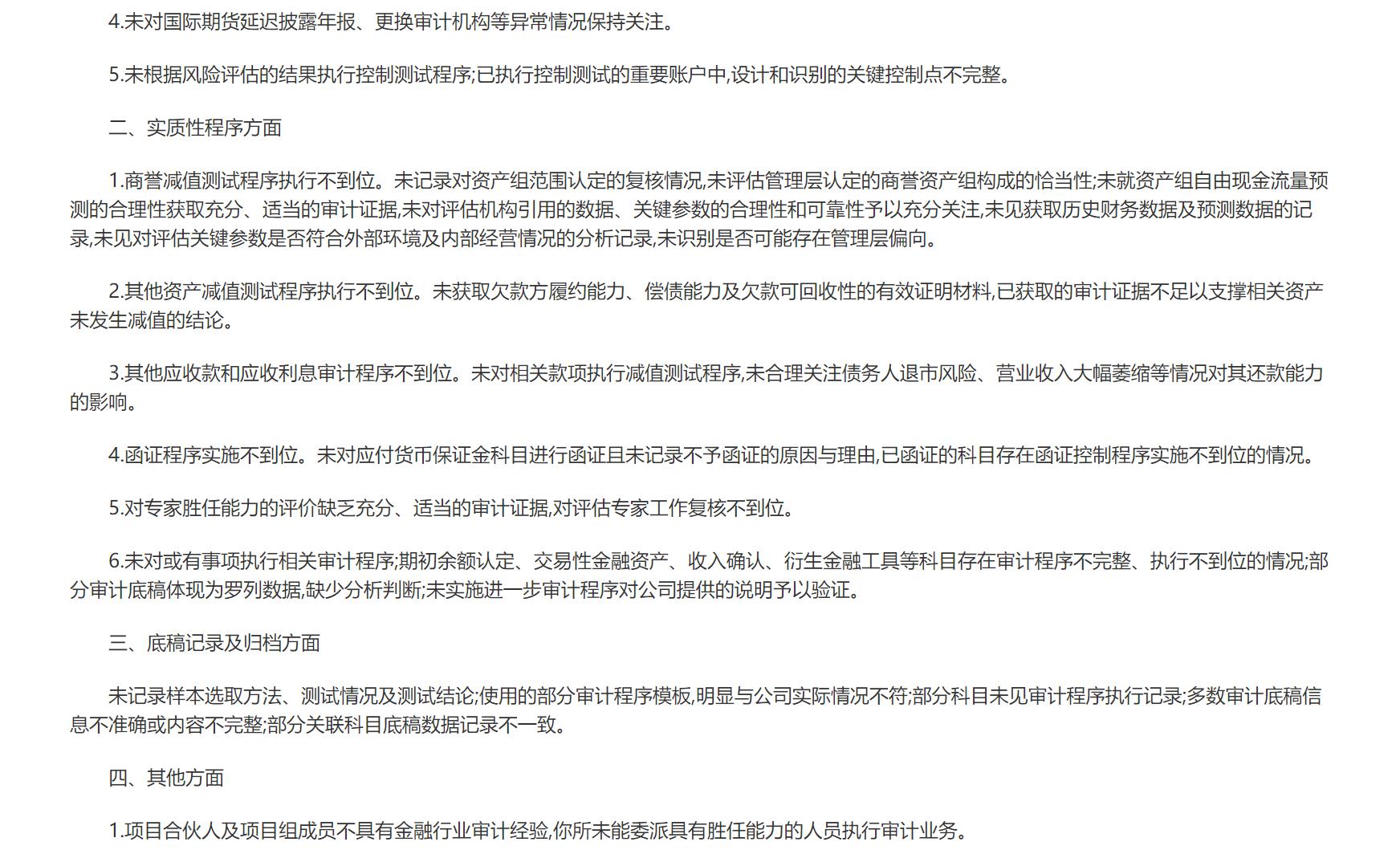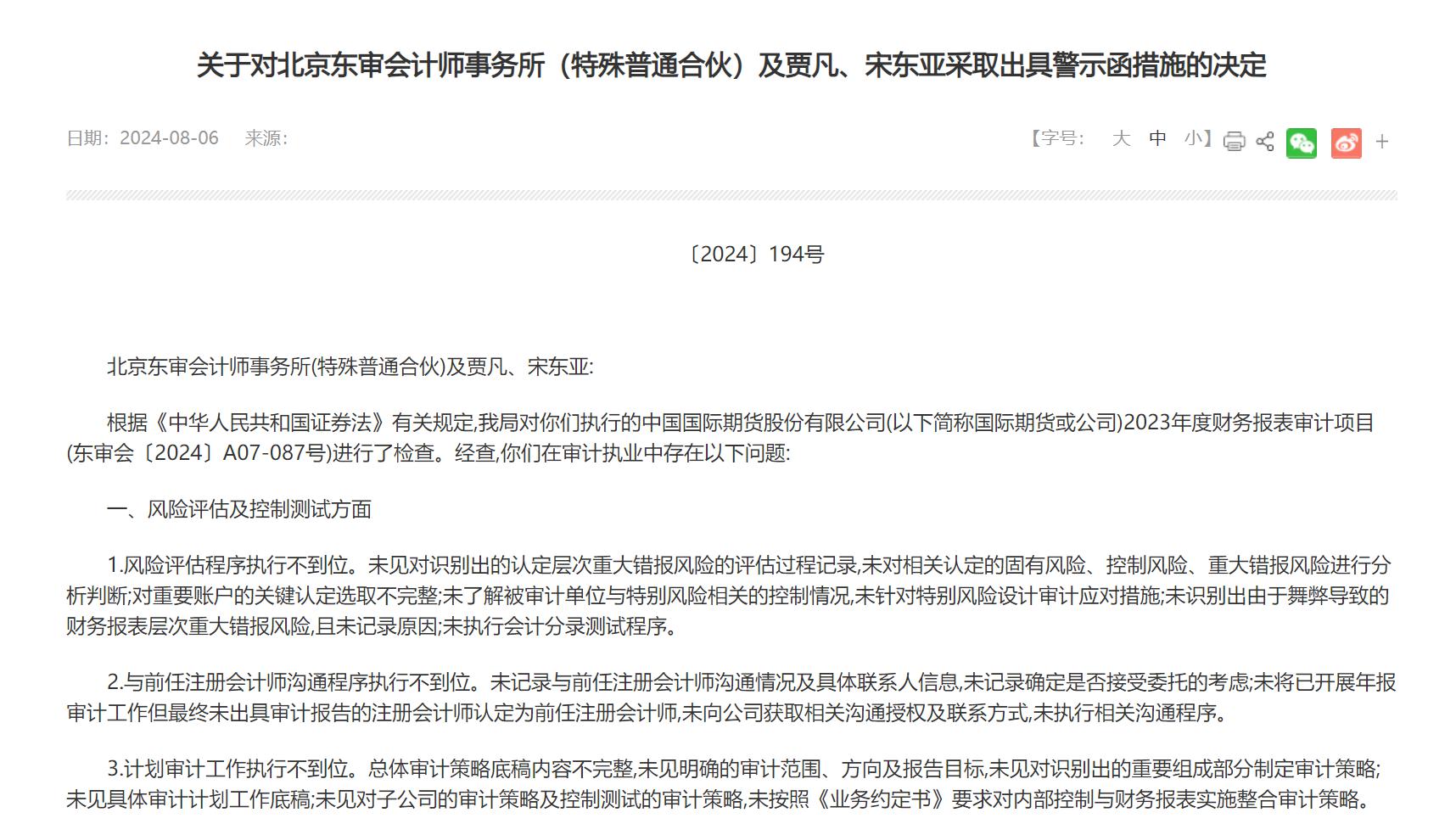 同时,根据《中华人民共和国证券法》有关规定,北京证监局对北京东审会计师事务所(特殊普通合伙)(简称:东审会计师事务所)及贾凡、宋东亚执行的国际期货2023年度财务报表审计项目(东审会〔2024〕A07-087号)进行了检查。经查,东审会计师事务所及贾凡、宋东亚在审计执业中存在风险评估程序执行不到位、与前任注册会计师沟通程序执行不到位、计划审计工作执行不到位、商誉减值测试程序执行不到位、其他资产减值测试程序执行不到位、其他应收款和应收利息审计程序不到位、函证程序实施不到位等问题。