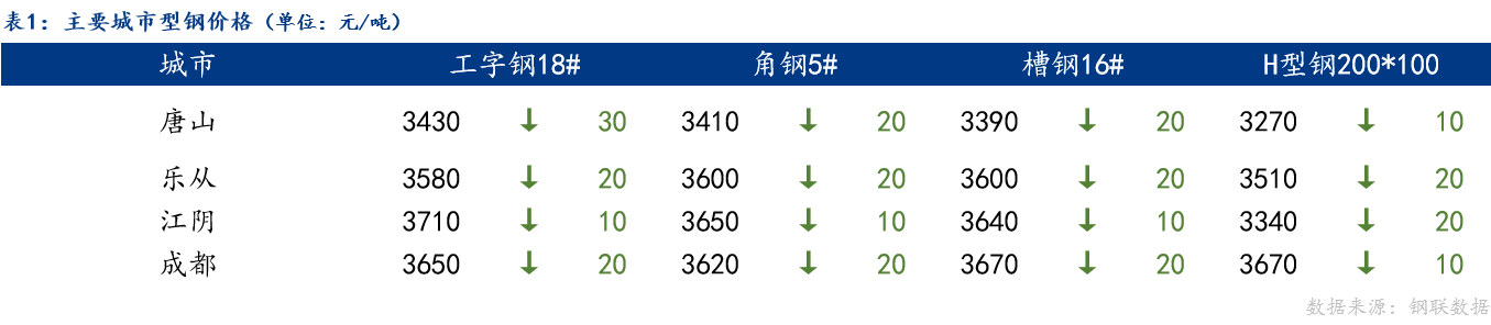 今日主流型钢价格趋弱调整,唐山工字钢、角钢、槽钢、H型钢价格较上一交易日下跌10-30元/吨;乐从工字钢、角钢、槽钢、H型钢价格较上一交易日下跌20元/吨;江阴工字钢、角钢、槽钢、H型钢价格较上一交易日下跌10-20元/吨;成都工字钢、角钢、槽钢、H型钢价格较上一交易日下跌10-20元/吨。