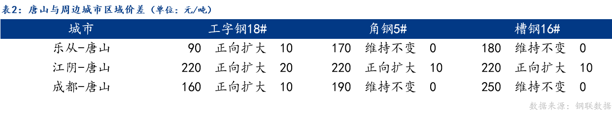 从区域价差来看,乐从工字钢,江阴工字钢、角钢、槽钢,成都工字钢与唐山价差正向扩大;乐从角钢、槽钢,成都角钢、槽钢与唐山价差维持不变。