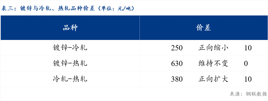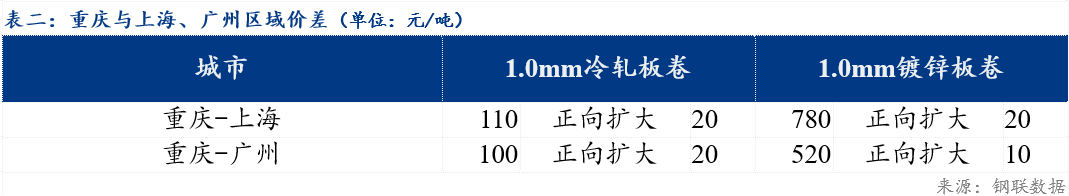 重庆、上海地区冷轧板卷区域价差扩大20元吨;重庆、广州冷轧板卷区域价差扩大20元/吨 。重庆、上海镀锌板卷区域价差扩大20元/吨 ;重庆、广州镀锌板卷区域价差扩大10元/吨。镀锌、冷轧品种价差缩小10元/吨 ;镀锌、热轧品种价差维持不变 ;冷轧、热轧品种价差扩大10元/吨。