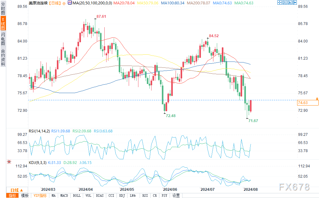 汇通财经APP讯——周三(8月7日),WTI原油期货小幅上涨,在50%至61.8%的关键回撤区间内盘整。盘中报74.42美元每桶,涨幅1.67%。尽管主要和次要趋势指标都指向下跌,但交易员似乎在捍卫6月4日的底部70.67美元。WTI原油期货盘中交易价格为74.45美元,上涨1.25美元或+1.71%。