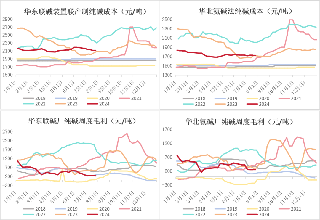 根据卓创资讯数据,截至2024年8月2日,华东联碱装置联产制纯碱成本为2120元/吨,较7月25日2110元/吨,周变动+10元/吨(+0.47%);华北氨碱法纯碱成本为1713元/吨,较7月25日1722元/吨,周变动-9元/吨(-0.52%).