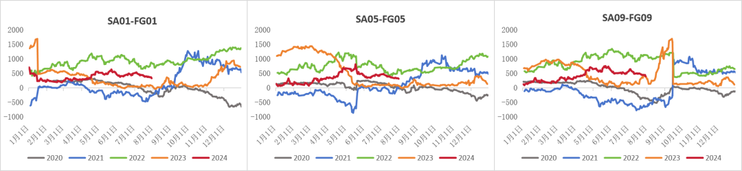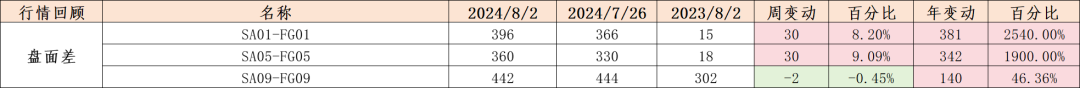 本周盘面价差增大。截至2024年8月2日,SA01-FG01为396,较上周上涨30,涨幅8.20%,较去年同期上涨381,涨幅2540.00%;SA05-FG05为360,较上周上涨30,涨幅9.09%,较去年同期上涨342,涨幅1900.00%;SA09-FG09为442,较上周下降2,跌幅0.45%,较去年同期上涨140,涨幅46.36%。