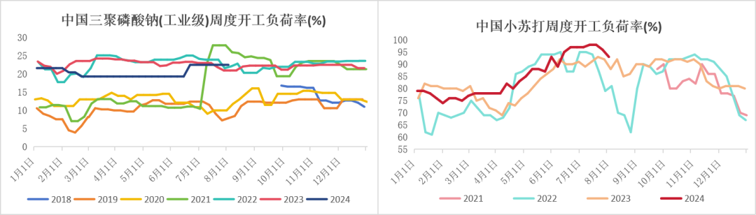 截至到2024年8月1日,中国小苏打周开工负荷率为93%,较7月25日周变动下降-3%;中国三聚磷酸钠(工业级)周度开工负荷率为22.51%,周内无变动。