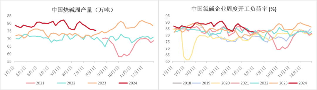 截至2024年8月2日,中国烧碱周产量为75.3万吨,较7月26日75.88万吨,环比下降0.58万吨(-0.76%);中国氯碱企业周度开工负荷率为82.44%,较7月26日83.08%,环比-0.64%。
