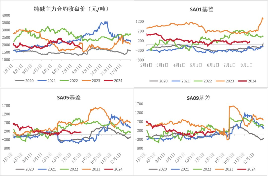 本周基差整体呈现走弱趋势。截至2024年8月2日,根据卓创资讯口径华北地区SA01基差81,较上周-95,跌幅53.98%,较去年同期-520,跌幅86.52%;SA09基差87,较上周-54,跌幅38.30%,较去年同期-48,跌幅35.56%。