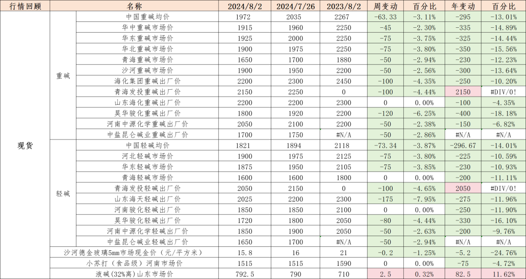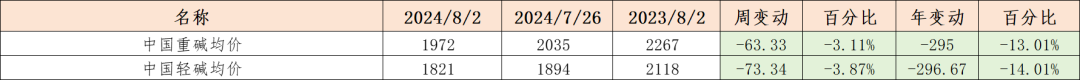 本周纯碱轻重碱现货价格小幅下跌,截至2024年8月2日,中国重碱均价1972元/吨,周变动-63.33(-3.11%),年变动-295(-13.01%);中国轻碱均价1821元/吨,周变动-73.34(-3.87%),年变动-296.67(-14.01%)