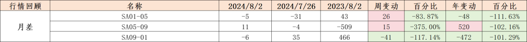 本周纯碱月差缩小,截至2024年8月2日,SA09-01价差-6元/吨,周变动-41,年变动-472;SA01-05价差-5元/吨,周变动+26,年变动-48.