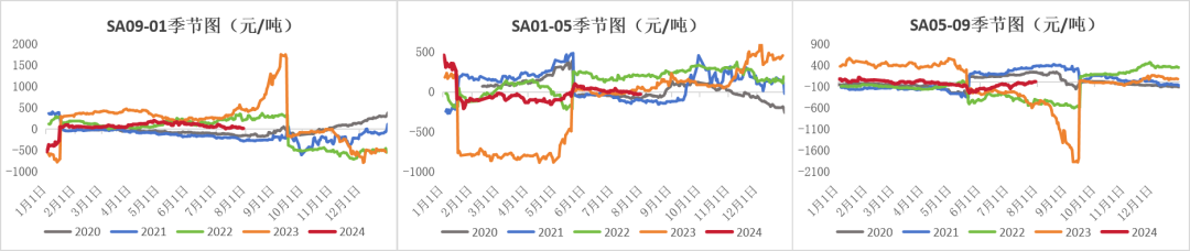 基差:中性 本周基差整体呈现走弱趋势。截至2024年8月2日,根据卓创资讯口径华北地区SA09基差87,较上周-54,跌幅38.30%,较去年同期-48,跌幅35.56%。