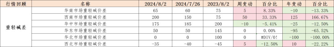 本周华南、西南地区市重轻碱价差增大。截至2024年8月2日,华南地区重轻碱价差为65元/吨,周变动+5(+8.33%),年变动-10(-13.33%);西南地区重轻碱价差为200元/吨,周变动+50(+33.33%),年变动+125(+166.67%)。
