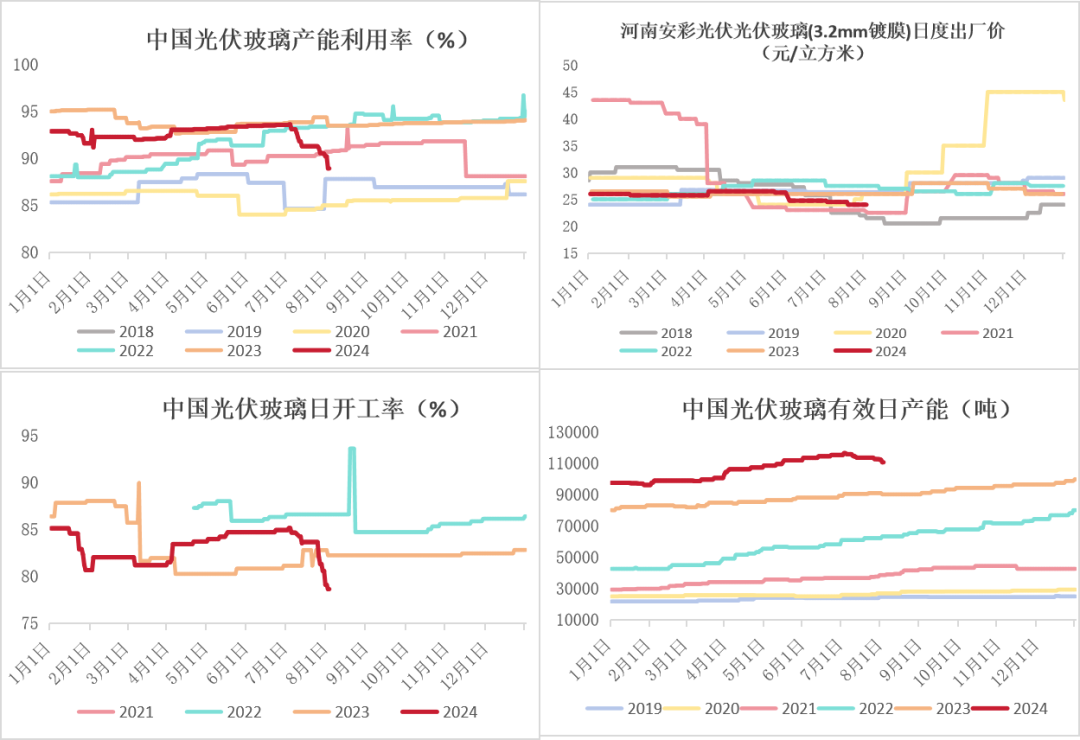 截至到2024年8月2日,全国光伏玻璃日产能利用率为88.93%,较7月26日90.57%,周变动下降-1.64%,同期年变动-4.56%。