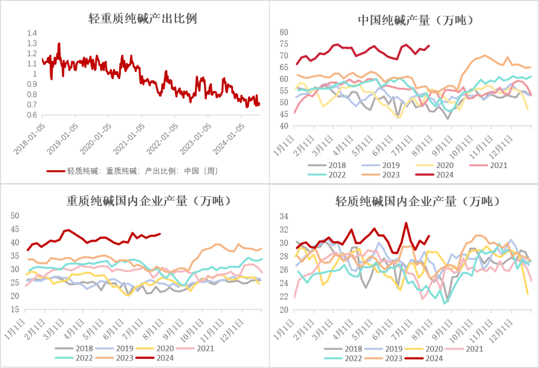 截至2024年8月2日,本周重质纯碱产量44.92 万吨,环比+1.76万吨(+4.08%);轻质碱产量 30.64 万吨,环比减少 0.4 万吨(-1.29%)。