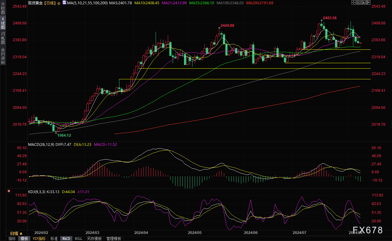 汇通财经APP讯——周四(8月8日)亚市盘初,国际油价窄幅震荡,目前交投于2384.98美元/盎司附近。随着美元和国债收益率上涨,金价周三反弹受阻,收报2382.85美元/盎司,跌幅约0.29%,尽管对美国9月降息的押注增加和中东地缘政治紧张局势加剧带来支撑,仍需提防金价下探100日均线2346.03附近支撑的可能性
