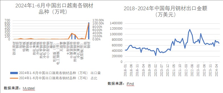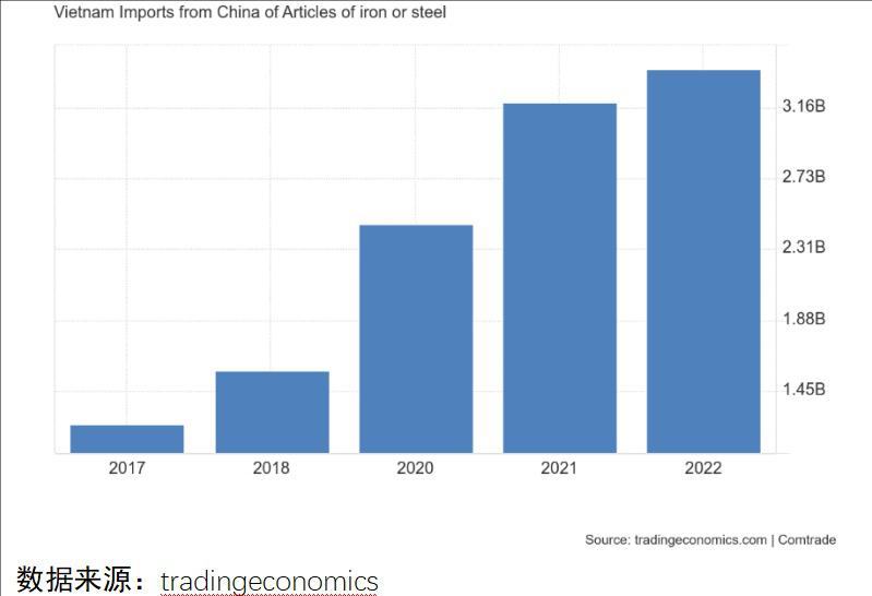 此外,中越经济联系紧密。虽然2016年至2023年期间,越南对进口钢铁产品发起了10起贸易防卫调查,其中大部分涉及原产于中国的钢铁产品。2019年,越南对部分中国钢铁产品征收了3.45%至34.27%的反倾销税。但从目前的贸易数据上看,越南进口的中国钢材金额保持上升趋势,这并不影响两国的长期贸易关系。