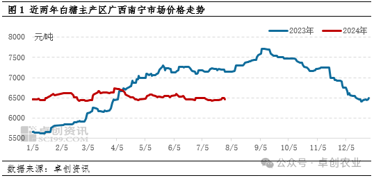 【导语】由于国际糖价下跌以及市场供强需弱施压,7月白糖市场整体呈现小幅走弱的震荡行情。糖厂库存同比偏高,叠加进口或将迎来高峰期,8月白糖市场供应宽松状态延续,预计白糖价格仍存下行空间。