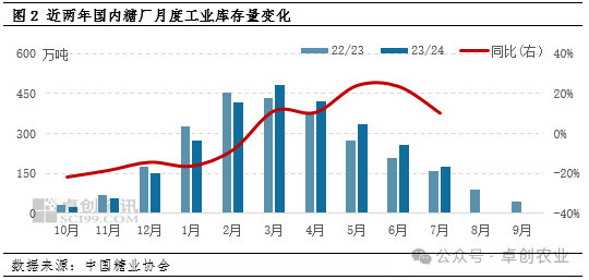 5月下旬国内糖厂榨季生产结束后进入纯销售期,库存不断下降,但由于2023/24年度国内白糖增产以及下半年进口加工糖压力逐渐显现,国产糖去库存进度放缓,糖厂库存一直高于去年同期水平。截至7月底,2023/24年度国内糖厂工业库存171万吨,同比增加7.66%。一般北方最早9月中下旬就有甜菜糖厂开机,届时新糖少量上市。过去三年全国8-9月累计平均销糖量160万吨左右,按照目前糖厂工业库存水平,即便不考虑市场其它糖源的补充,整体供应端也维持宽松状态。