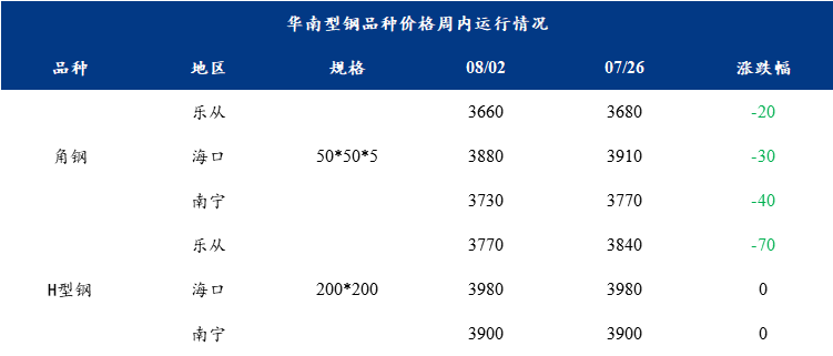 表1:华南型钢品种价格汇总(单位:元/吨)