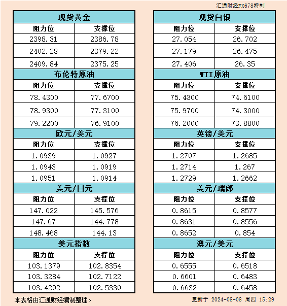 汇通财经APP讯——8月8日欧市黄金、白银、原油、美元指数、欧元、英镑、日元、瑞郎、澳元支撑阻力位一览。