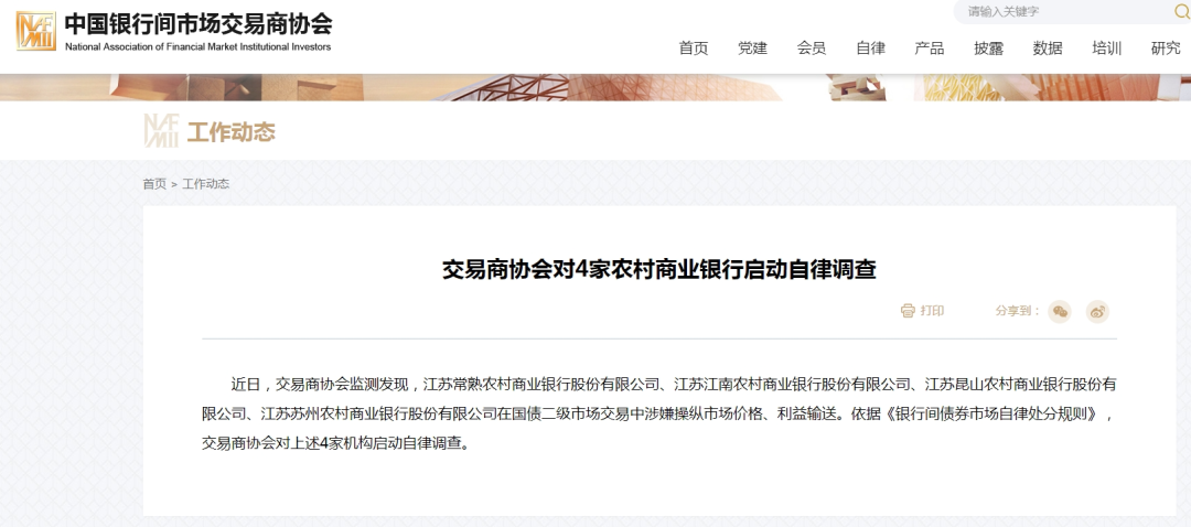 就在前一天(8月7日),交易商协会通报称,近日,交易商协会监测发现,江苏常熟农村商业银行股份有限公司、江苏江南农村商业银行股份有限公司、江苏昆山农村商业银行股份有限公司、江苏苏州农村商业银行股份有限公司在国债二级市场交易中涉嫌操纵市场价格、利益输送。依据《银行间债券市场自律处分规则》,交易商协会对上述4家机构启动自律调查。