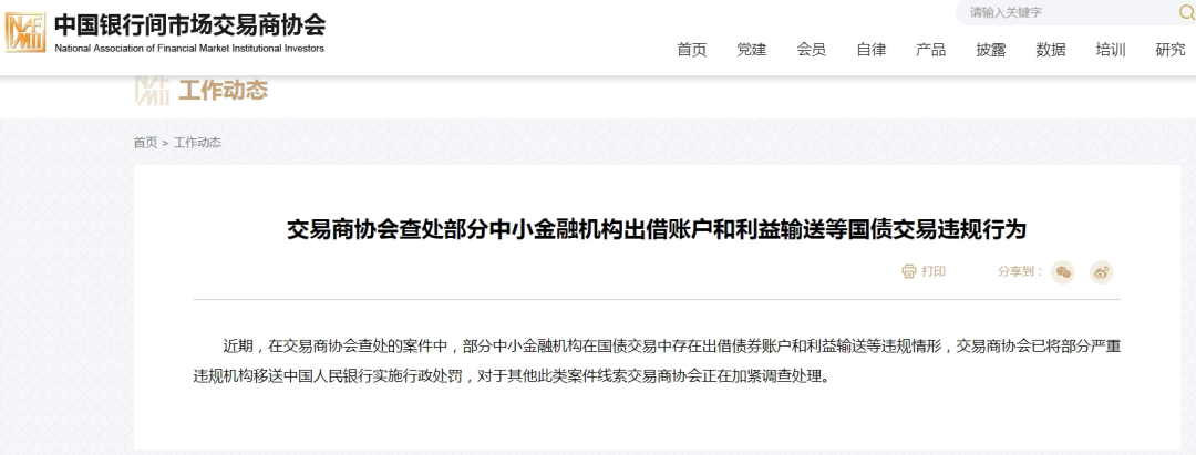 8月8日,中国银行间市场交易商协会(以下简称“交易商协会”)官网公告称,近期,在交易商协会查处的案件中,部分中小金融机构在国债交易中存在出借债券账户和利益输送等违规情形,交易商协会已将部分严重违规机构移送中国人民银行实施行政处罚,对于其他此类案件线索交易商协会正在加紧调查处理。