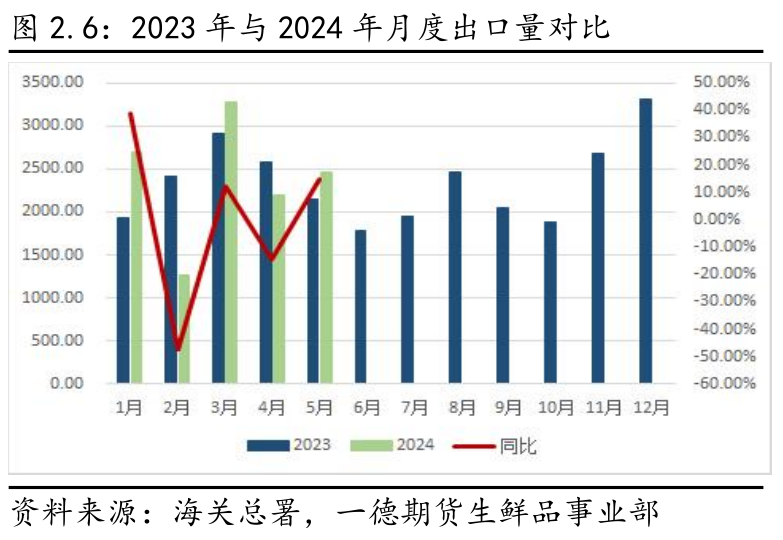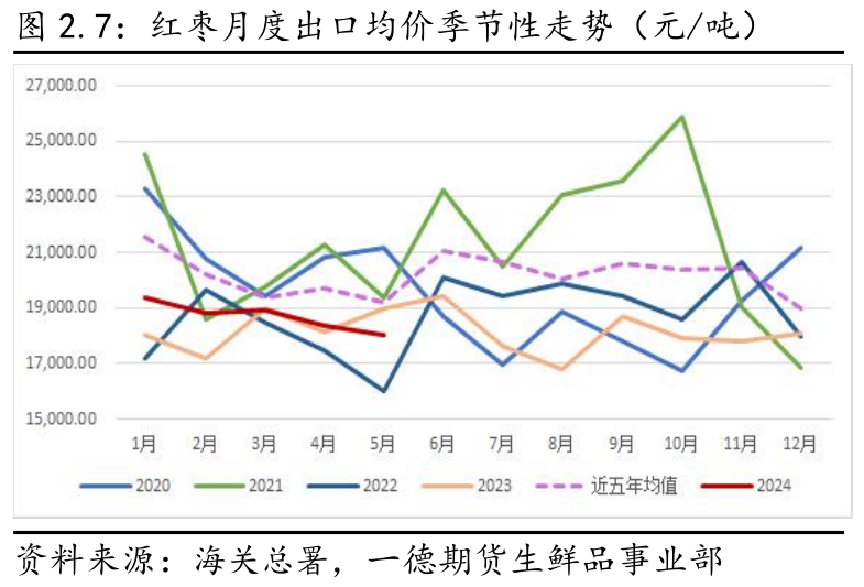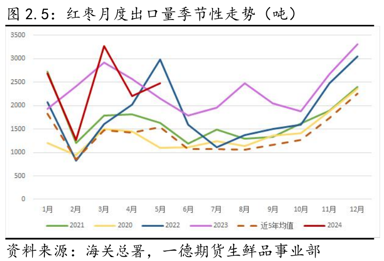 据海关总署数据显示,2024年1-5月红枣出口量合计11896.89吨,累计同比-0.73%,出口均价低于近五年均值。