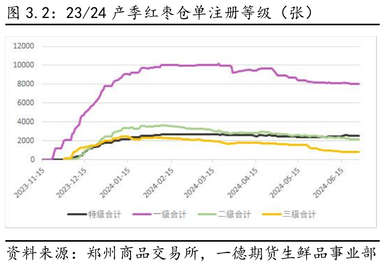 现货价格跌幅较大。以沧州市场灰枣为例,截止到6月底特级报价12.3元/公斤,较年初下跌2.4元/公斤,一级下跌2.3元/公斤,二级下跌1.3元/公斤。各等级现货价格均出现不同程度的下滑,主要有以下两方面原因,一方面现货旺季不旺,导致行情低迷表现为价格走弱;另一方面3月消费步入传统淡季,市场弱预期下,期价深跌贴水现货,仓单点价贸易增多,大量仓单持续流入现货市场,现货压力凸显,价格进一步追跌。