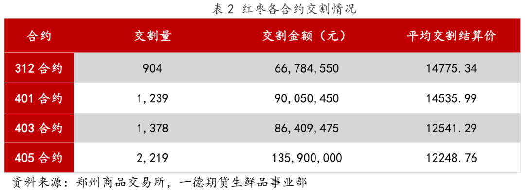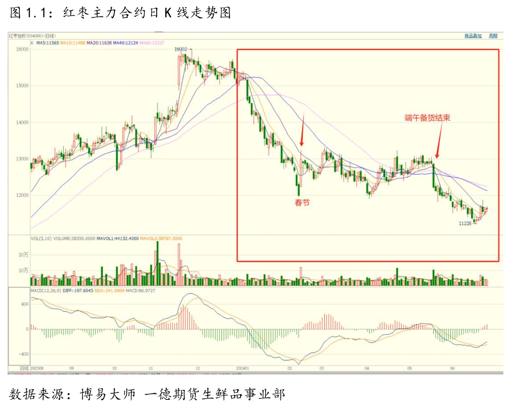 第三阶段:先跌后涨,呈“V”走势。红枣消费进入传统淡季,仓单回流现货市场,市场交易弱现实,随着节后补货仓单流出,仓单成为市场供应主力,现货交易定价围绕盘面运行,叠加端午和五一备货形成提振,盘面震荡上行。