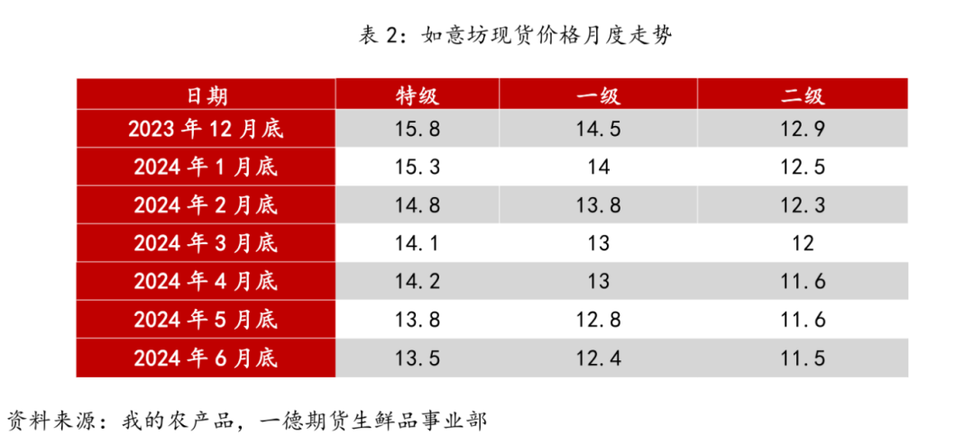 现货价格,截止到6月底,如意坊市场特级报价13.5元/公斤,较年初下滑2.3元/公斤,一级下滑2.1元/公斤,二级下滑2.1元/公斤。