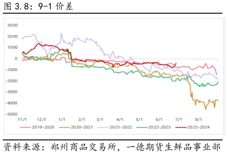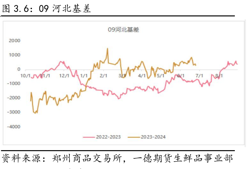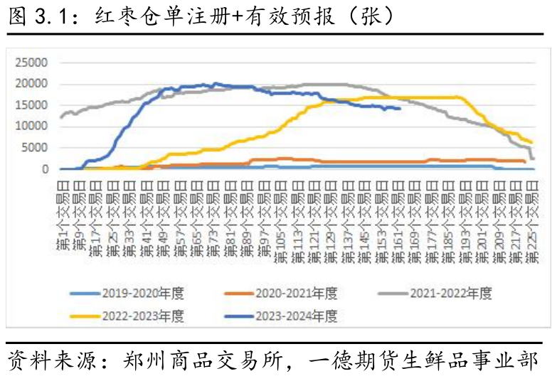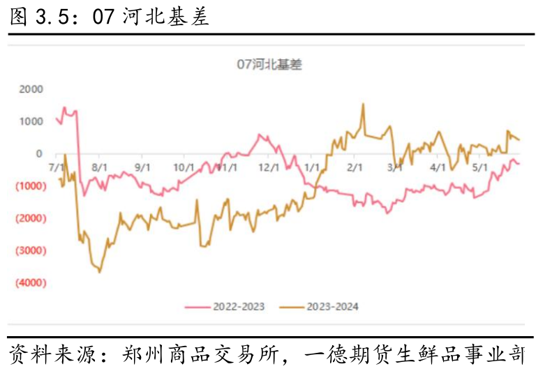 第四阶段:5月下旬-6月底,震荡下行。红枣基本面表现弱势,一方面端午备货结束后需求端进入季节性淡季,另一方面随着基差走强,带来的仓单注销回流到现货市场,拖拽现货行情不断走弱。叠加新季枣树长势正常,市场存恢复性增产预期。