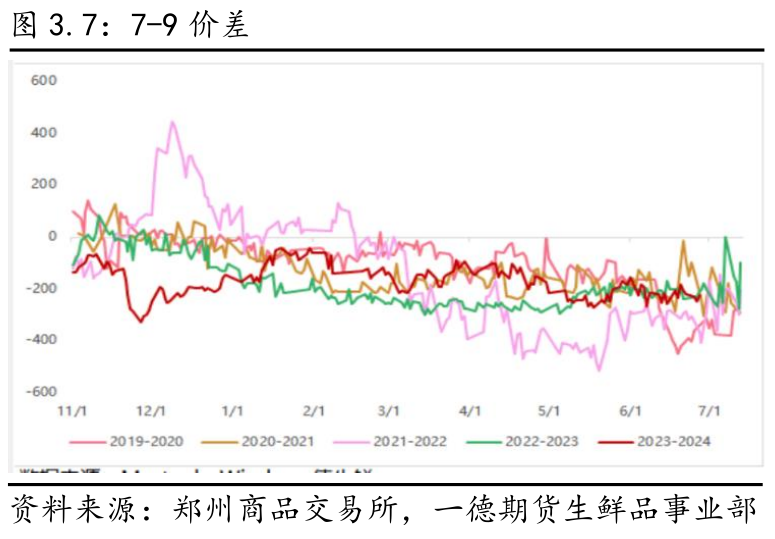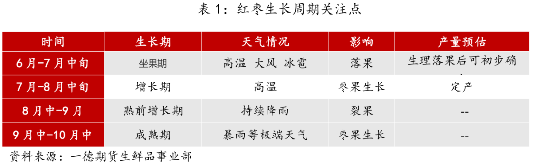 新季生长情况。4月南疆温度上升,产区积温高于去年同期,促使枣树萌芽和开花较去年提前15-20天左右,5月底进入盛花期,6月上旬迎来集中环割,目前环割已进入收尾阶段,叠加枣农投入增加管理积极性提高,从当前长势来看处于正常水平,暂未有明显异动情况,7月需重点关注生理落果。近年来天气异常情况增多、高温、干旱、冰雹、沙尘暴等,坐果期高温,持续干热风给水不及时会影响产量,影响产量变化的因素众多,例如高温、干旱、管理、冻树、授粉时间、环割技术及环割时间等。9月-10月成熟期降雨会对质量影响较大。