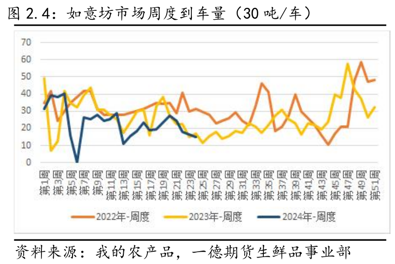 沧州市场,上半年日均到货量高峰期集中主要1月最后一周的春节备货期,以及4月下旬至5月中旬的五一、端午备货期,到货质量参差不齐成品等外均有,大级别好货相对偏紧,一般货供应充足,而实际消化三成左右,4月天气转热存在入库及二次销售情况,市场货源整体充足。