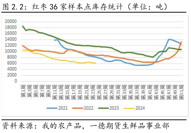 据我的农产品调研数据统计,截止到6月27日36家样本点物理库存6054吨,同比减少47.76%,处于近四年最低值。上半年红枣走货量共计4530吨,库容比减少42.80%,较2023年同期走货量减少2333吨,但库容比消耗方面增加5.68%。除交易所仓单库存外,社会库存多数余货集中沧州地区企业及期现公司手中,货权集中度较高。