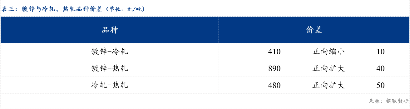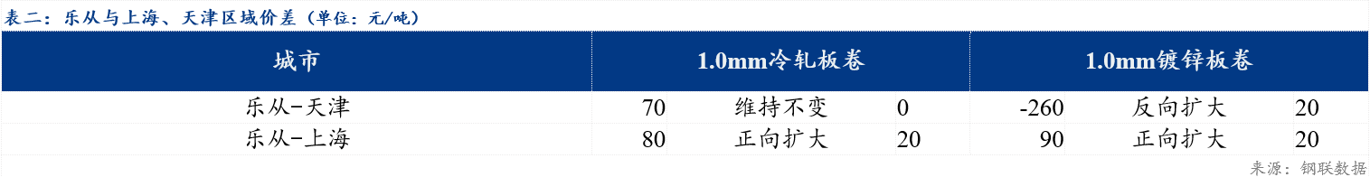 今日冷轧板卷乐从与天津价差较上一交易日持平,乐从与上海价差较上一交易日扩大20元/吨;镀锌板卷乐从与天津价差较上一交易日扩大20元/吨,与上海价差较上一交易日扩大20元/吨。品种价差方面,镀冷价差较上一交易日收窄10元/吨,镀热价差较上一交易日扩大40元/吨,冷热价差较上一交易日扩大50元/吨。