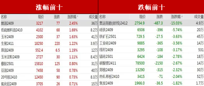 午盘收盘,国内期货主力合约涨跌不一。燃料油涨超2%,玉米、SC原油、生猪涨超1%;跌幅方面,集运欧线跌超15%,硅铁跌超5%,铁矿石、工业硅跌超3%,碳酸锂、锰硅跌超2%,螺纹钢、纯碱、菜粕、沪镍、PVC跌超1%。