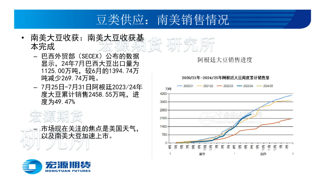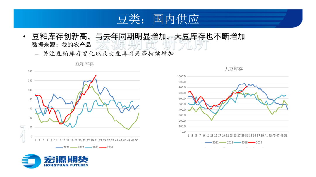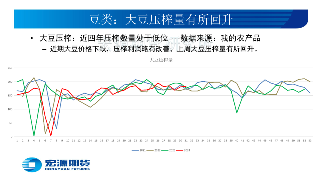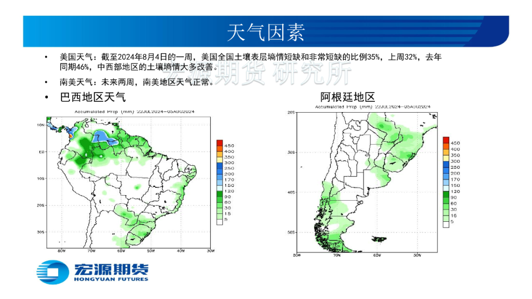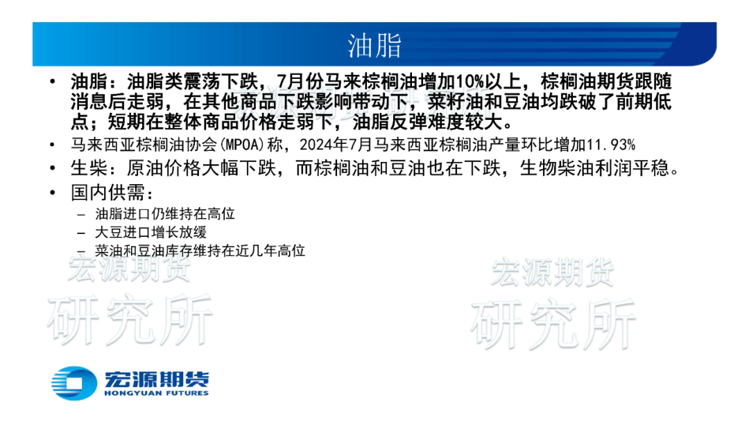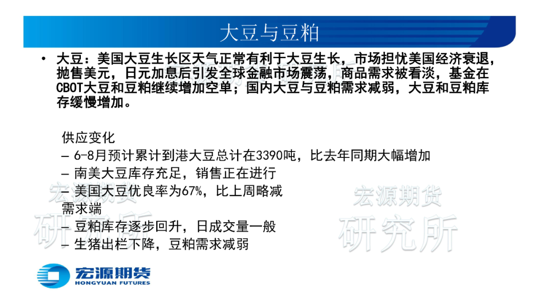 大豆:美国大豆生长区天气正常有利于大豆生长,市场担忧美国经济衰退,抛售美元,日元加息后引发全球金融市场震荡,商品需求被看淡,基金在CBOT大豆和豆粕继续增加空单;国内大豆与豆粕需求减弱,大豆和豆粕库存缓慢增加。