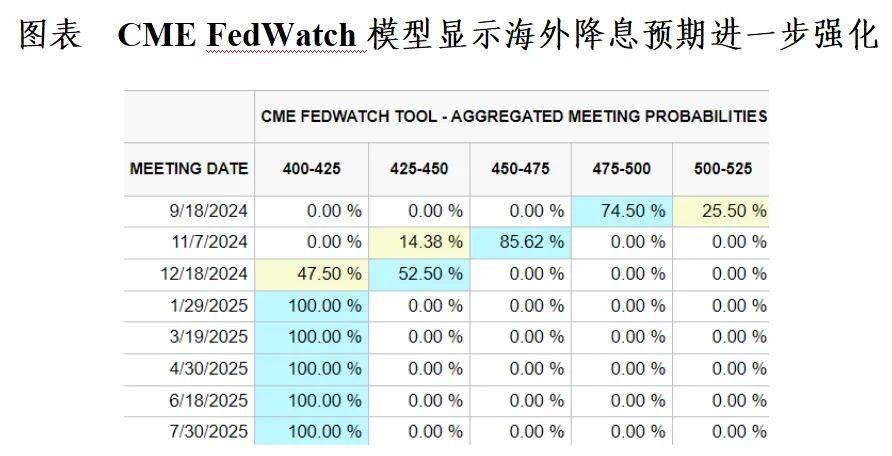 当前海外市场预期,美联储或迫于经济衰退风险在9月启动降息,甚至可能出现超预期的货币宽松操作。截至8月8日,CME FedWatch模型由外盘联邦利率期货价格反推的降息概率显示,美联储2024年9月降息25bp几率为25.5%,降息50bp几率升至74.5%。直至2024年11月累计降息75bp几率85.62%,累计降息100bp几率14.38%。直至2024年12月累计降息100bp几率52.50%,累计降息125bp几率47.50%。