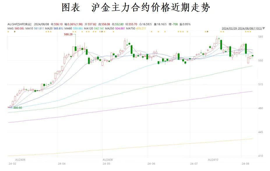 8月8日下午收盘,沪金涨0.36%至556.10元/克,本周周初以来累计下跌2.72%;沪银跌0.36%至6929元/千克,周初以来累计下跌6.88%。由于上周五就业数据全面降温引发对于美国经济衰退的担忧,以及日本央行加息导致套息交易逆转带来流动性冲击,本周周初海外市场一度出现恐慌性的资产抛售及资本回流,使得市场波动加剧,贵金属价格也在这种局部的流动性风险期间下跌,沪金触及5月以来的震荡区间下沿,随后在周中止跌企稳;沪银因其工业属性更强,跟随有色板块回落,表现偏弱,目前在5月初前低附近运行。