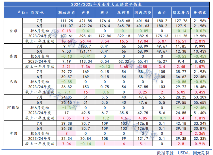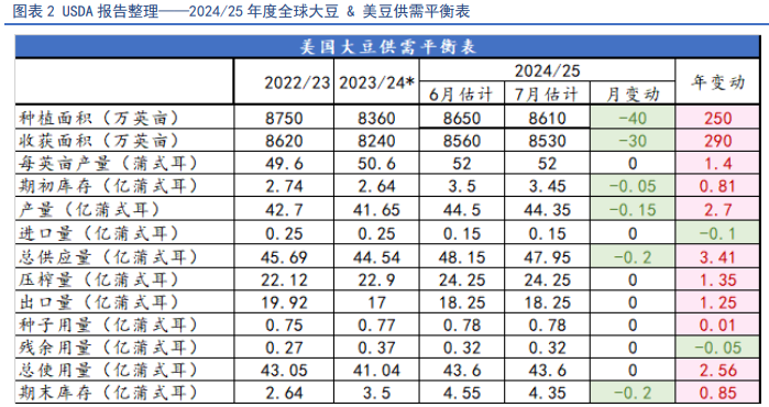13日凌晨,美国农业部(USDA)公布7月美豆供需报告,报告数据略偏多看待,但在美豆种植良好背景之下,缺乏对市场的影响。报告数据显示美豆2024/25年度的产量高于预期、单产高于预期、库存低于预期。具体来看,2024/25年度美国大豆播种面积下调40万英亩至8610万英亩,而大豆单产维持在创纪录的52蒲/英亩不变,使得2024/25年度美国大豆产量调低到44.35亿蒲,比上月调低了1500万蒲,但是高于分析师预估的44.24亿蒲式耳,且比上年增长6.5%,也是仅次于2021/22年度的历史次高产量。报告将大豆期末库存调低2000万蒲至4.35亿蒲,但是同比增长900万蒲,增幅达26.1%,居于近五年来最高水平。