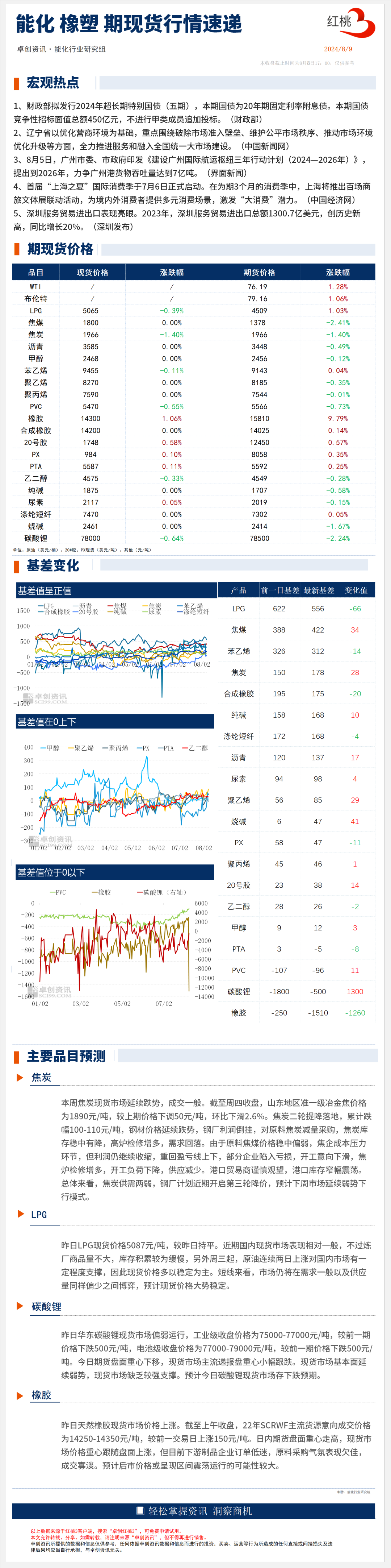 监测能源化工行业22个期货品种,其中10个品种上涨,12个品种下跌。其中涨幅最大的是橡胶,涨幅9.79%;跌幅最大的是焦煤,跌幅为2.41%。