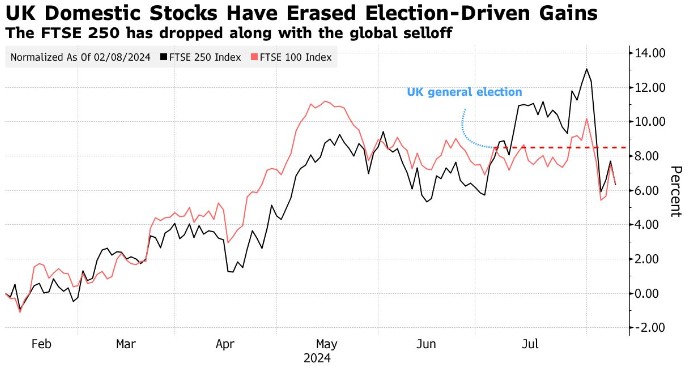 英国工党选举获胜后,英镑开启了上升之路。但现在,随着压力的增加,外汇交易员正在寻找保持乐观的理由。在本月初英国央行进行自2020年以来首次降息后,投资者对英镑已经转向谨慎态度,但他们没有预见到疲弱的美国数据和日本市场的动荡给英镑带来冲击。而且在英国,反移民骚乱和加税前景冲淡了大选后的乐观情绪,也加剧了英镑从一年高点的下跌。目前,英镑兑美元从一年高点下跌超过2%,至1.27附近。